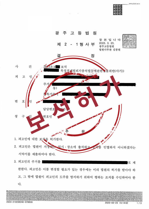 재판부는 피고인의 서약서 제출, 주거지의 제한 등 보석조건을 상세히 부과하는 조건으로 피고인에 대한 보석을  허가 하였습니다.