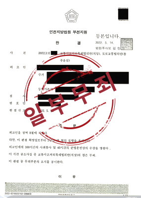 1. 사건 경위 의뢰인은 과거 음주운전 전력이 3차례 있었음에도 또 다시 음주운전 및 교통사고처리특례법위반(치상)으로 적발되어 변호인에게 제1심 변호를 의뢰하였습니다. 2. 법무법인 로연 변호사의 조력 민준우 변호사는 대한변호사협회 형사전문변호사로 등록하여 활동하고 있고, 음주운전, 무면허운전, 교통사고처리특례법위반(업무상과실…