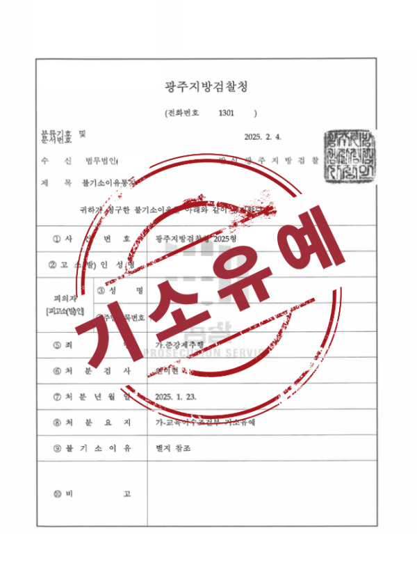 검찰은 사건 자료와 참작 사유를 종합해 교육조건부 기소유예처분을 결정했습니다. 이로써 의뢰인은 중대한 혐의에도 불구하고 재판 없이 사건을 종결하고, 형사처벌과 전과를 피할 수 있었습니다.